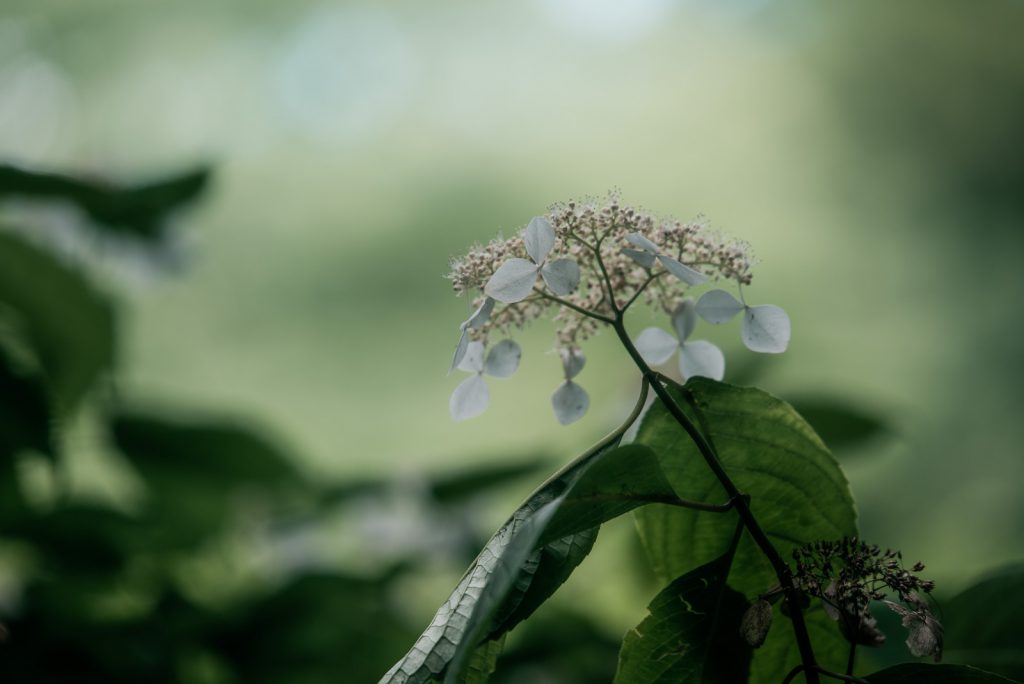 さて、本命の紫陽花はといいますと、これが久々に撮ってみて難しいなというのが正直なところでした。いつものことながら撮影現場で感じることの少ないワタシなので、自身で撮影したものを見返していて思ったんですが、被写界深度をどうあわせていけばいいのかが分かってない感じです。この日は絞りはF値3.2を基本に5.6と8あたりを切り分けながら撮影してみたんですが、F3.2だと花のひとつの塊も上手く表現できないことが多く、背景もボケすぎてしまって、どうにもしっくりこない感じになってしまってました。ただ、少し絞って撮影すると、今度は葉の印象が強すぎ、ワタシが思っている感じには全くなりませんでした。そういう意味ではガクアジサイの方が絵になりやすく、どうしてもそちらを撮りがちになってしまいますね。